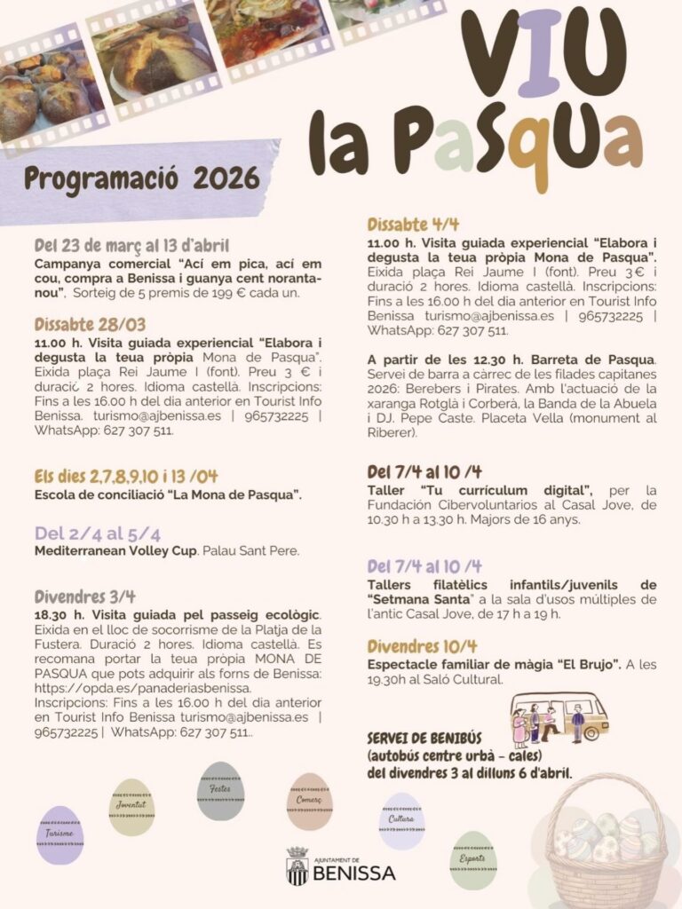 • 11:00 h – Visita guiada experiencial: «Elabora y degusta tu propia Mona de Pascua». Salida desde la Plaça Rei Jaume (font). Precio: 3 €. Duración: 2 horas. Inscripciones hasta las 16:00 h en el Tourist Info de Benissa.