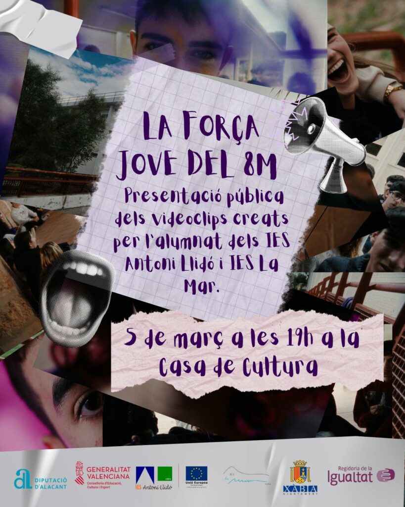 Las actividades darán comienzo el 5 de marzo, a las 19:00 horas en la Casa de Cultura, con el acto La fuerza joven del 8M. Este evento destacará los videoclips creados por el alumnado de los institutos Antoni Llidó y La Mar, dando protagonismo a la voz de los jóvenes en este día tan especial.