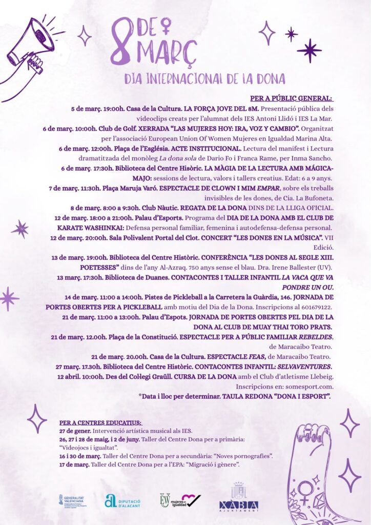 El Ayuntamiento de Xàbia ha dado a conocer la variada programación con la que celebrará el Día Internacional de la Mujer, que se conmemora el 8 de marzo.