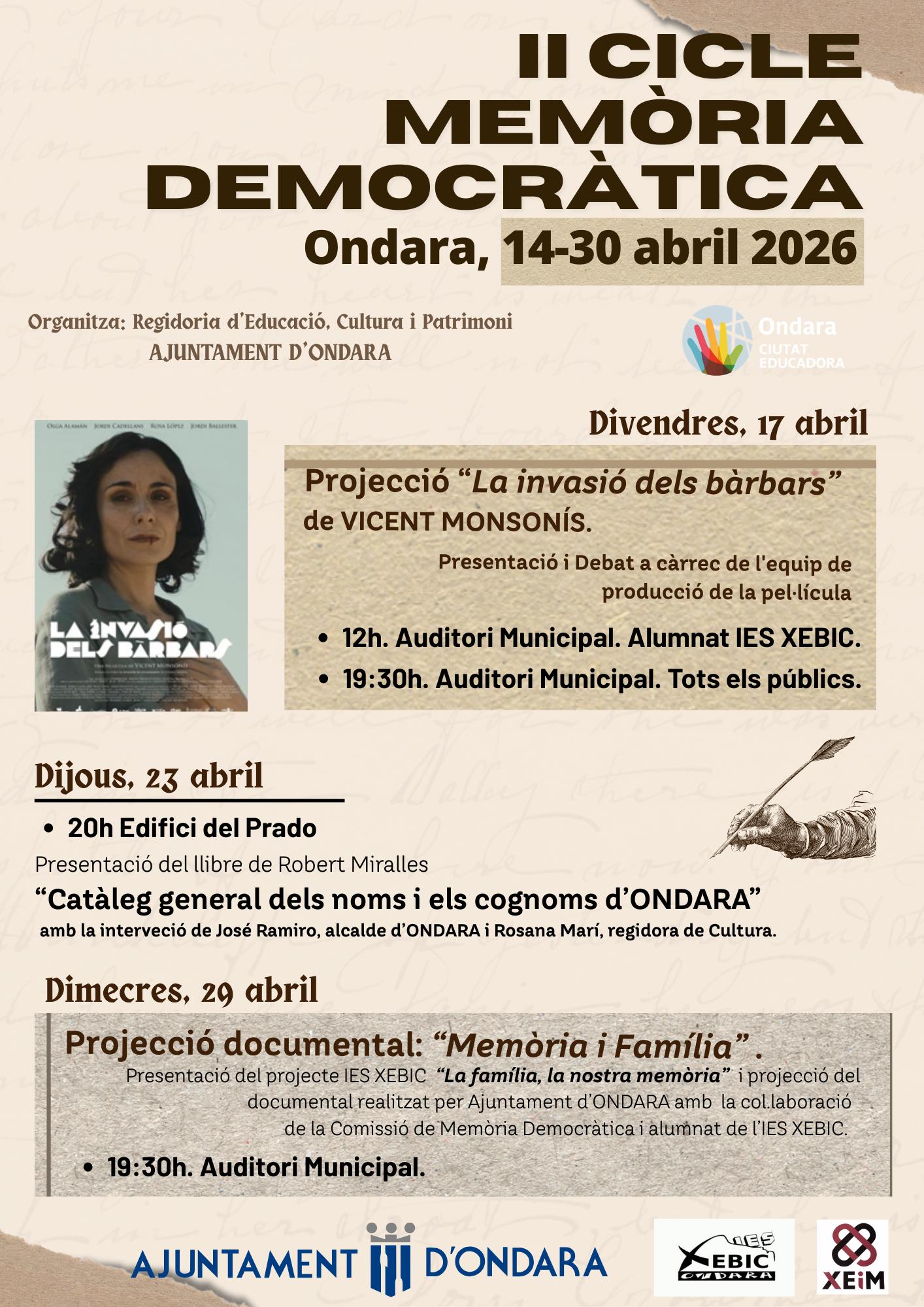 El Ayuntamiento de Ondara, a través de la concejalía de Educación, Cultura y Patrimonio, organiza del 14 al 30 de abril de 2026 el II Ciclo de Memoria Democrática, una iniciativa enmarcada en el proyecto Ondara Ciudad Educadora que tiene como objetivo fomentar la reflexión crítica, la transmisión de valores democráticos y la recuperación de la memoria histórica a través de la cultura, la educación y la participación ciudadana.