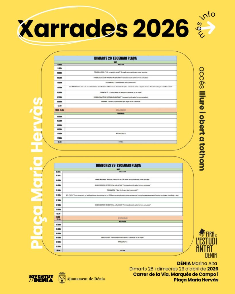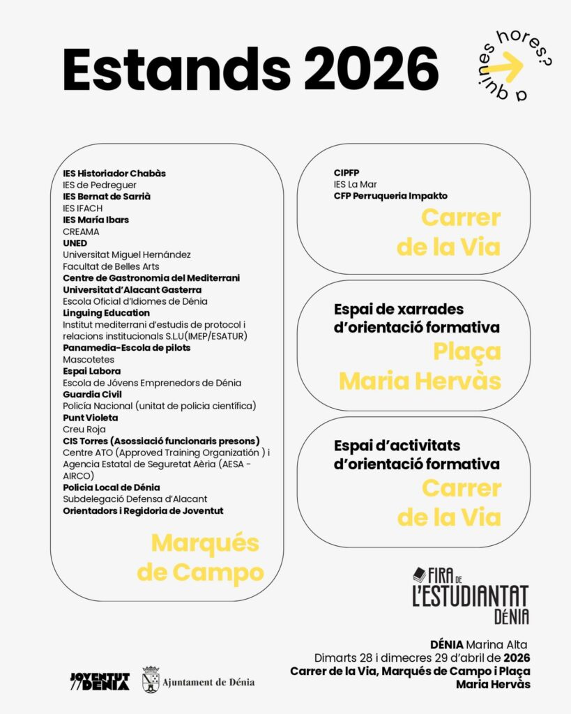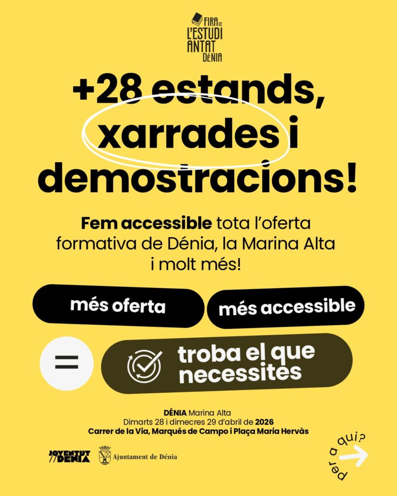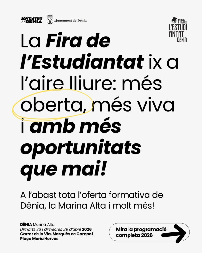 Dénia celebrará los próximos 28 y 29 de abril una nueva edición de la Fira de l’Estudiantat, que este año introduce un cambio significativo en su planteamiento: el traslado de buena parte de su actividad al espacio urbano. Bajo el lema “Més oberta, més viva i amb més oportunitats que mai”, la iniciativa pretende ganar visibilidad y facilitar el acceso a la información académica y profesional.