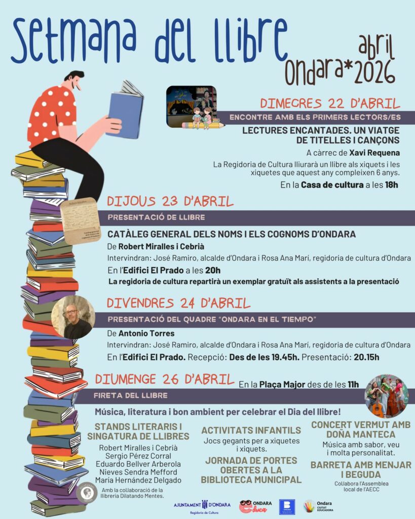 Ondara, a través de su Concejalía de Cultura, se encuentra celebrando durante todo el mes de abril el Mes del Llibre, un evento cultural que busca fomentar la lectura y poner en valor la identidad literaria local. La concejala de Cultura, Rosa Ana Marí, destacó que este mes es “una apuesta firme del Ayuntamiento para acercar la lectura a todas las edades”, desde los primeros lectores hasta el público adulto, con actividades pensadas para compartir, aprender y celebrar la cultura.